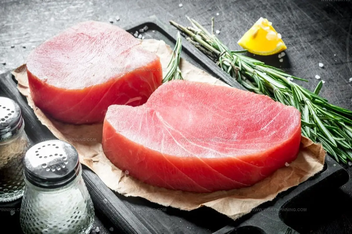 Tuna steak shows different colors from deep red to soft pink based on its fat and lean meat mix. Spotting a brown shade on raw tuna signals possible freshness issues.