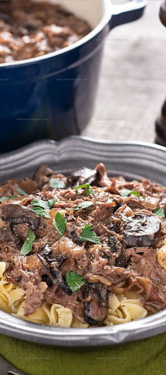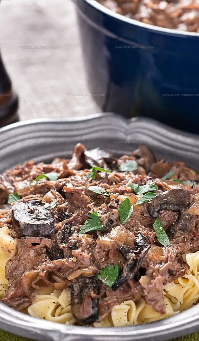 Hearty chuck roast transforms into tender morsels bathed in rich, creamy sauce.