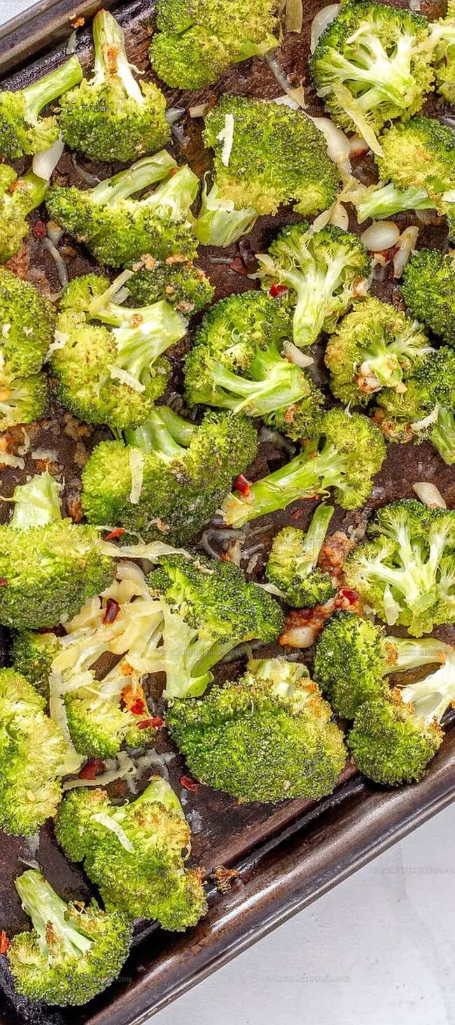 - Withdraw the pan from the oven and sprinkle freshly grated parmesan cheese over the hot broccoli, allowing the residual heat to melt the cheese slightly.