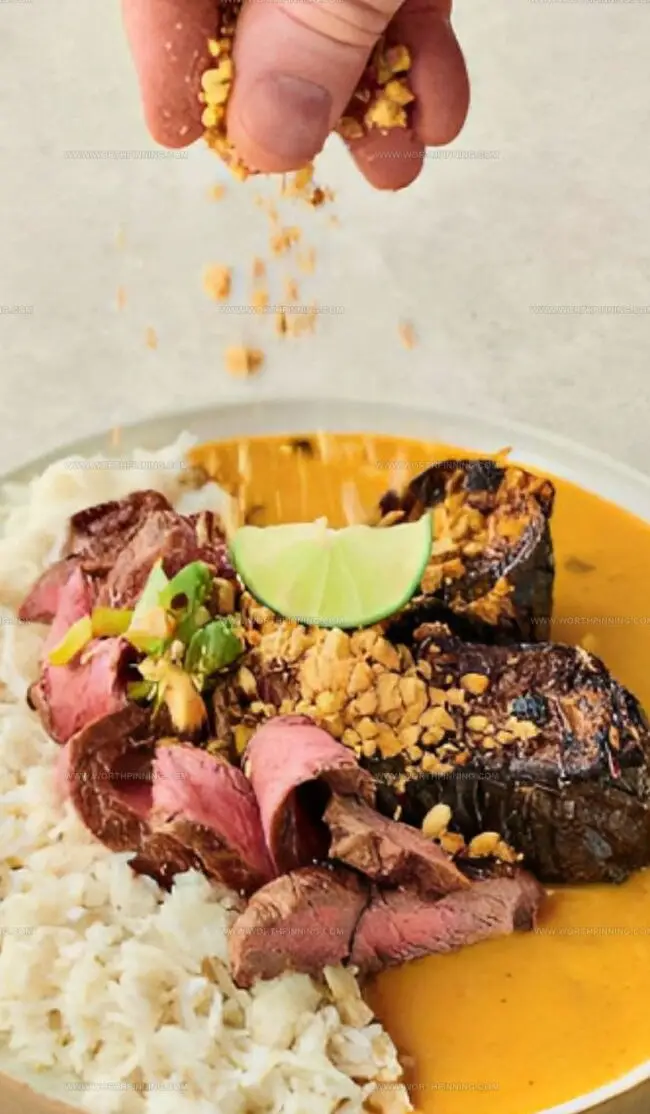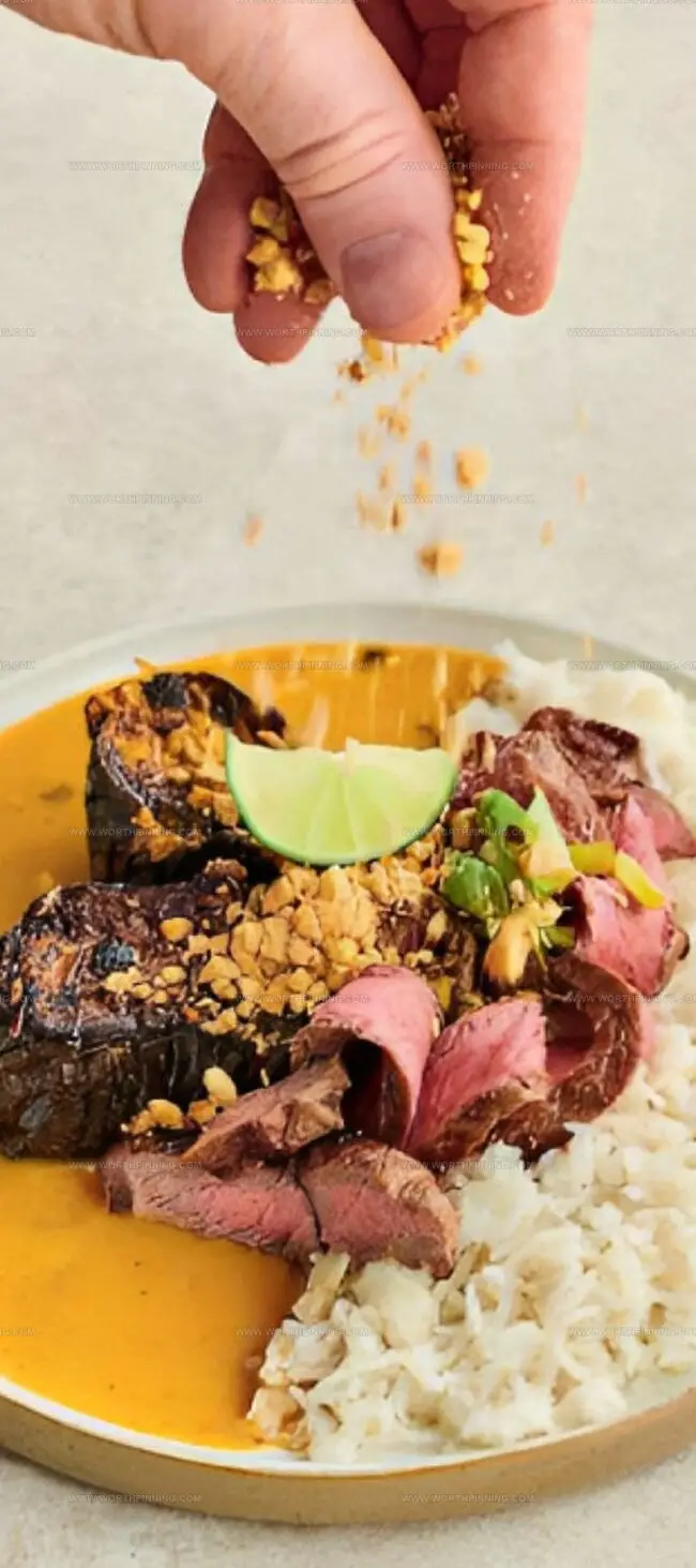 - Plating and Finishing: Fluff rice and distribute on serving plates. Arrange sliced steak, charred spring onions, and aubergine on top. Drizzle meat resting juices into the sauce and spoon over the dish. Sprinkle crushed peanuts and serve with lime wedges.