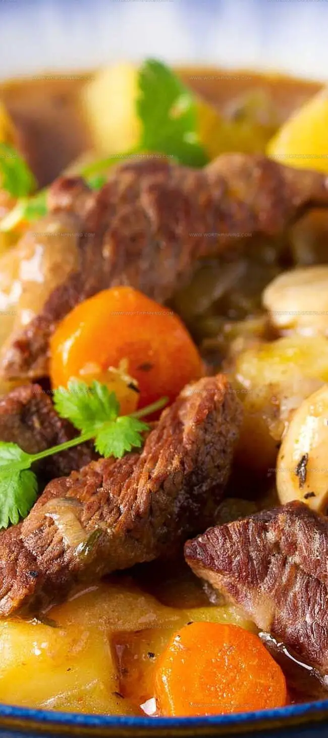 Robust beef chunks nestle among tender vegetables, creating a culinary masterpiece of rustic elegance.