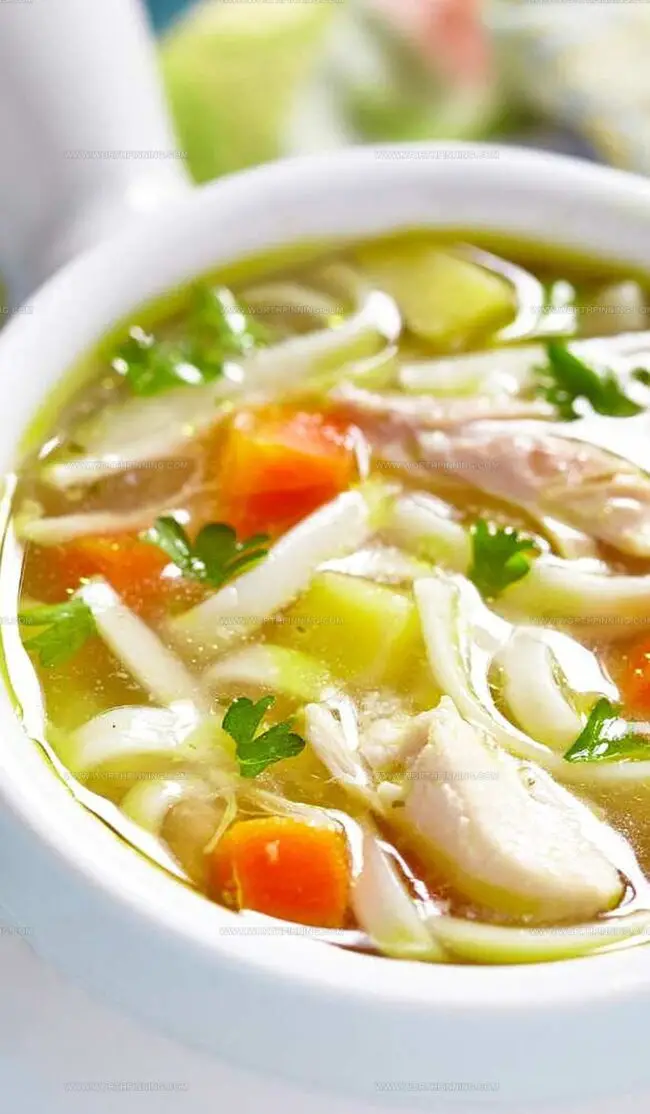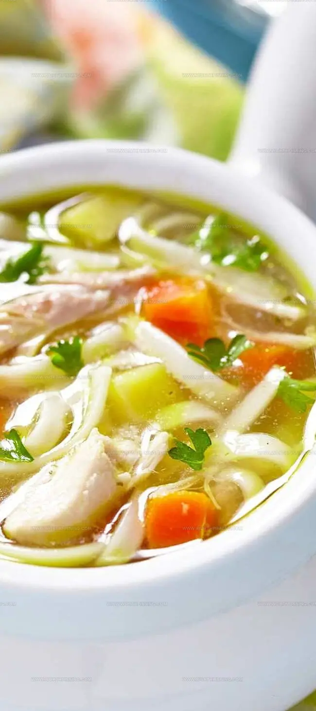 Warm broth embraces tender chicken, creating symphony of hearty flavors.