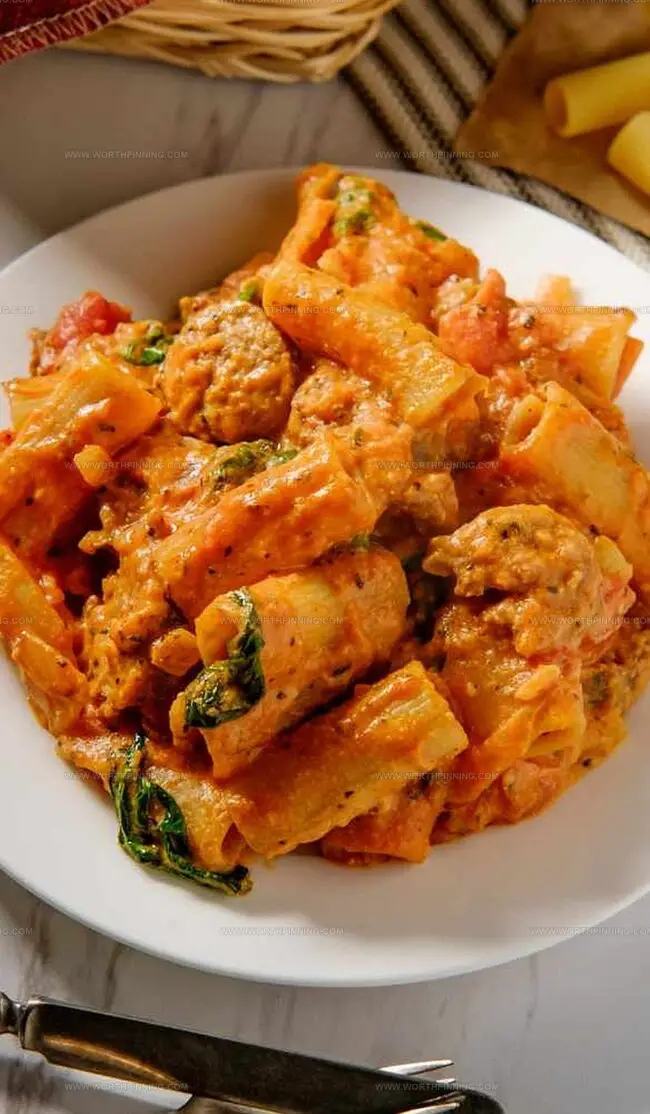 - Fill a large pot with salted water and bring to a rolling boil. Cook the rigatoni pasta according to package directions until perfectly tender yet firm. Carefully extract and reserve 1/2 cup (120 milliliters) of pasta water, then drain the pasta completely.