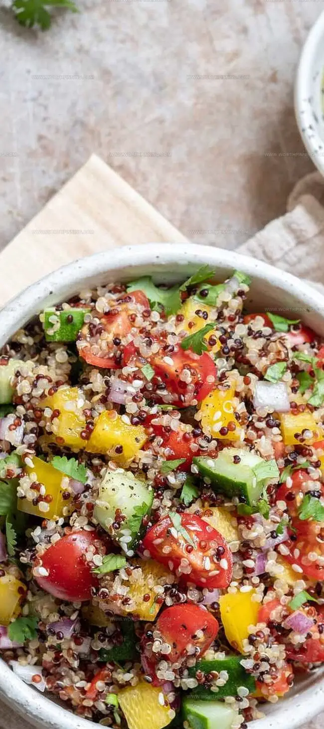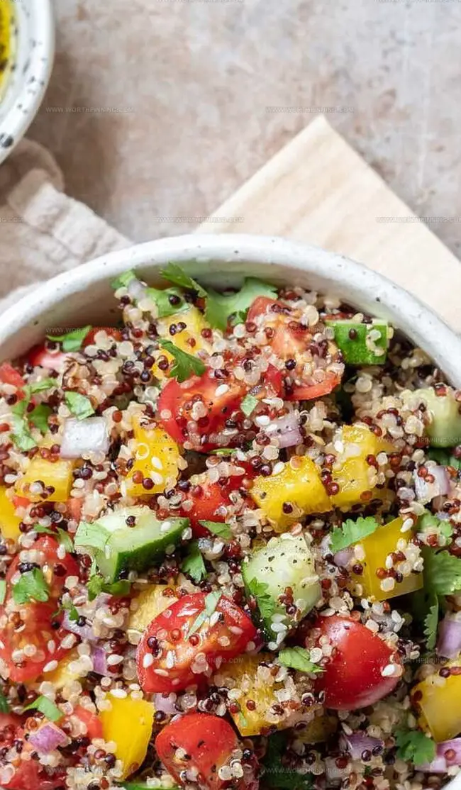 - Pour the prepared vinaigrette over the quinoa mixture, gently tossing to ensure every ingredient is evenly coated with the vibrant dressing.