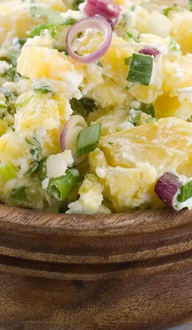 - Pour the prepared dressing over the salad, using a soft spatula to mix ingredients without breaking the potatoes.