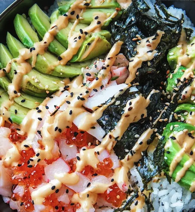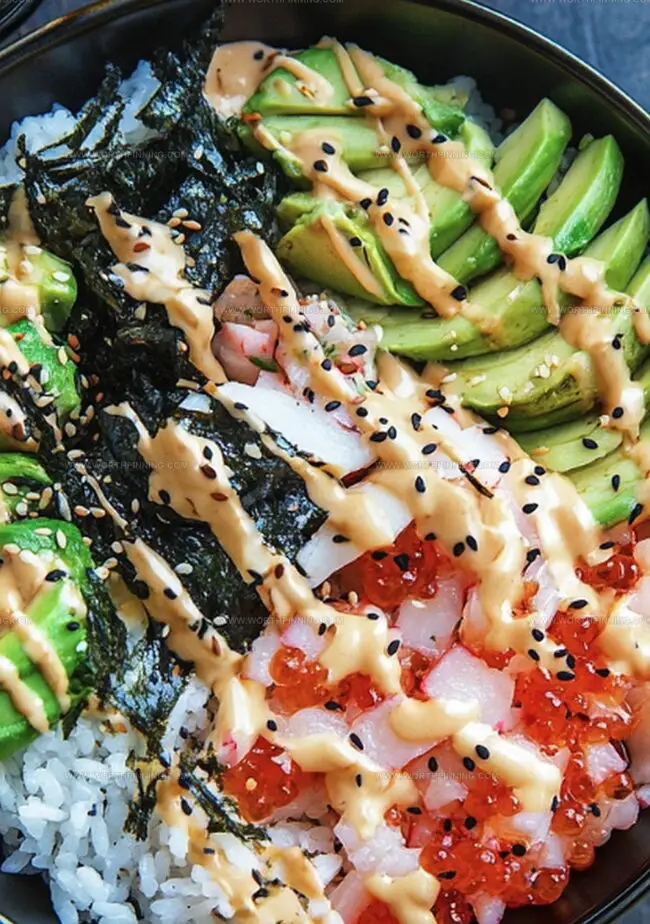 Protein Layer: – Imitation Crab: Mild-flavored seafood substitute that adds protein and a traditional sushi roll feel to the bowl.
