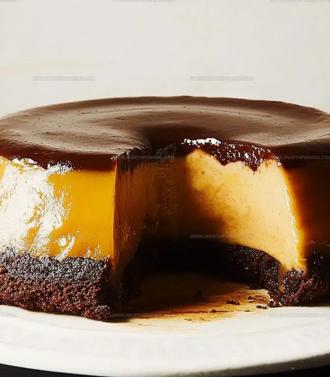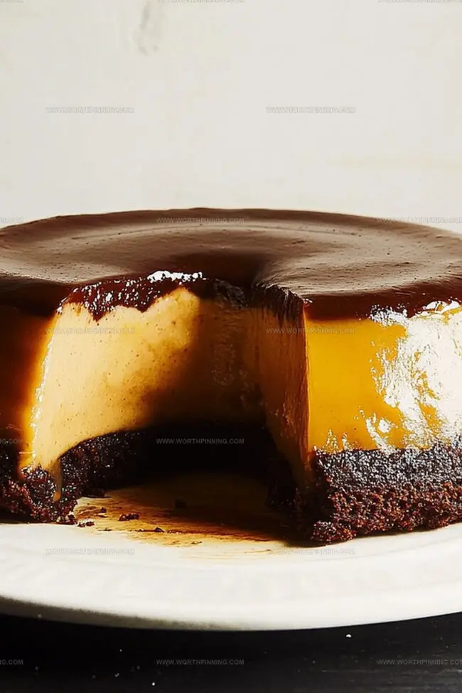 Layers of rich, decadent chocolate swirl beneath a smooth, creamy flan surface, creating a dessert that looks impossible.