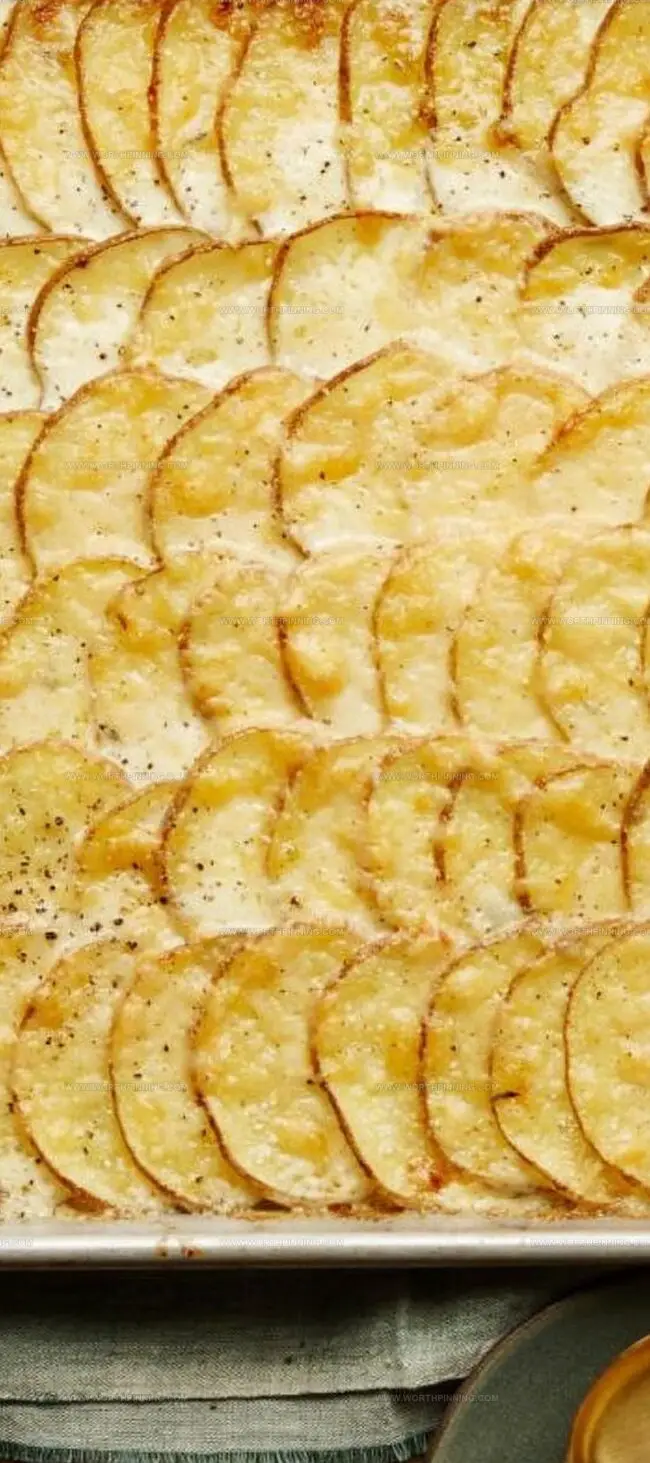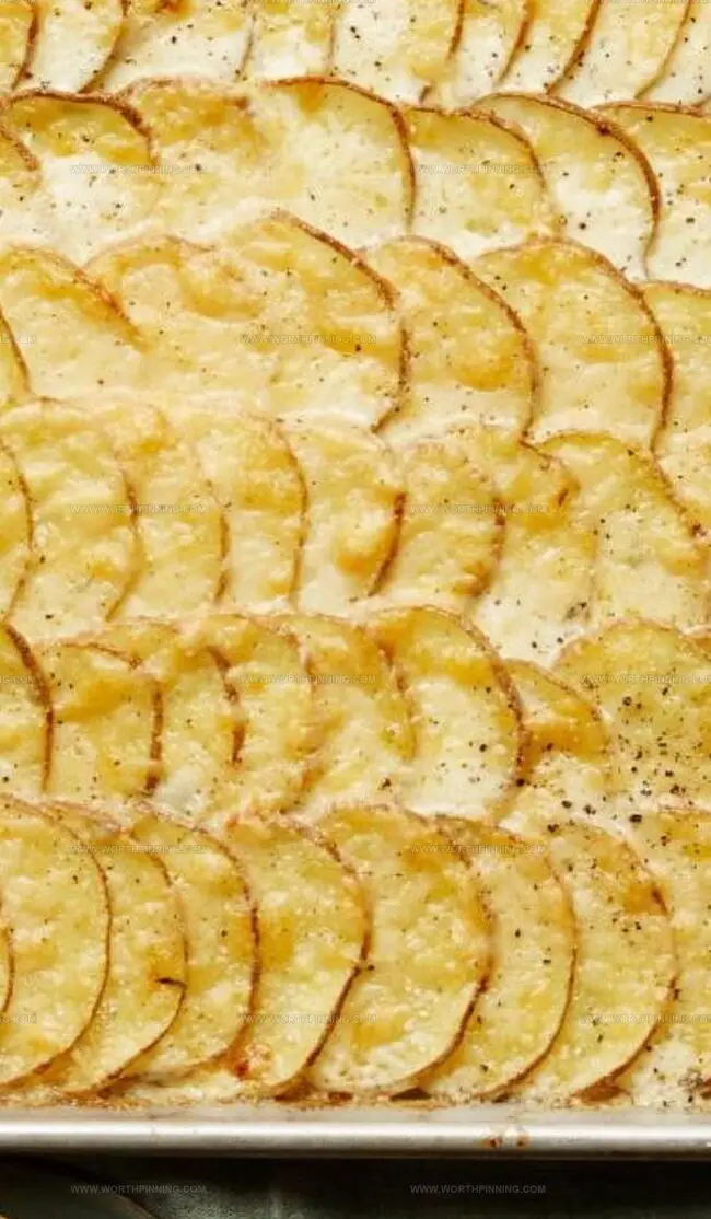 Create a stunning landscape of potato layers across the pan. Sprinkle salt and Parmesan like you’re casting a delicious spell. Each layer tells a tasty story.