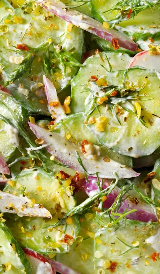 Combining and Chilling: Integrate cucumber and red onion slices into the dressing, ensuring complete coating. Refrigerate for at least 30 minutes to allow flavors to meld and intensify, developing a rich, harmonious taste profile. Serve cold as a refreshing accompaniment or standalone dish.