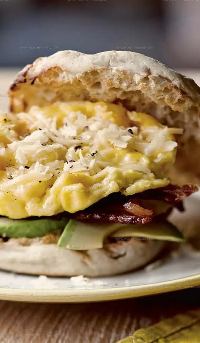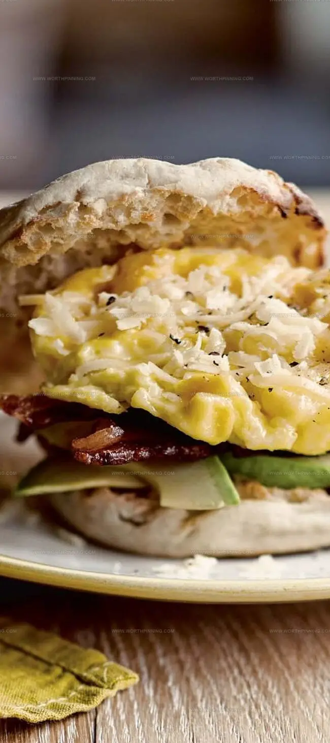 Sandwich Construction Layer bottom muffin with creamy avocado slices. Arrange bacon pieces for extra crunch. Slide cheesy eggs on top, crown with muffin top, and get ready for flavor explosion.