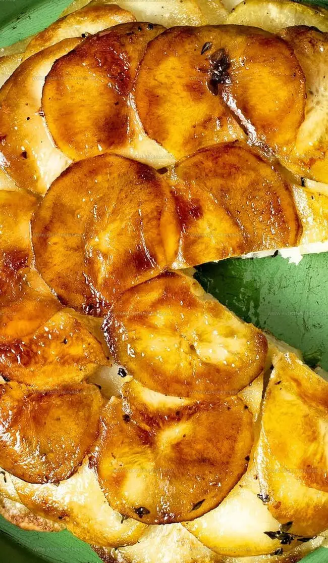 This golden-kissed potato cake dazzles with its crisp, buttery layers that shimmer like edible architecture.