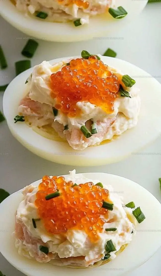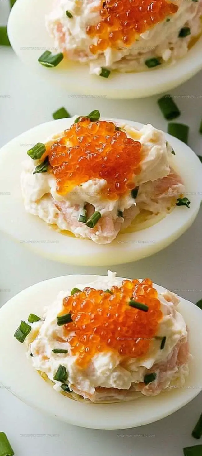 - Finishing Touches: Garnish each deviled egg with a pristine salmon roe dollop and a refined chive sprinkle. Add a whisper of salt and pepper to elevate the sensory experience just before serving.