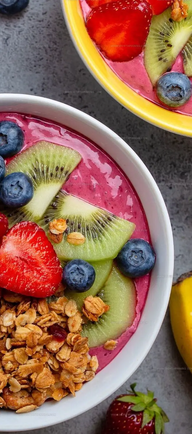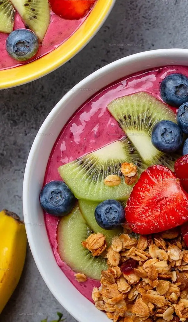 Pour the luscious mixture into a beautiful bowl and let your creativity shine. Sprinkle on a rainbow of toppings like crisp strawberry slices, golden banana rounds, crunchy granola, tiny chia seeds, fluffy coconut shreds, and delicate almond slivers. Make each bowl a unique masterpiece that celebrates your morning energy and style.