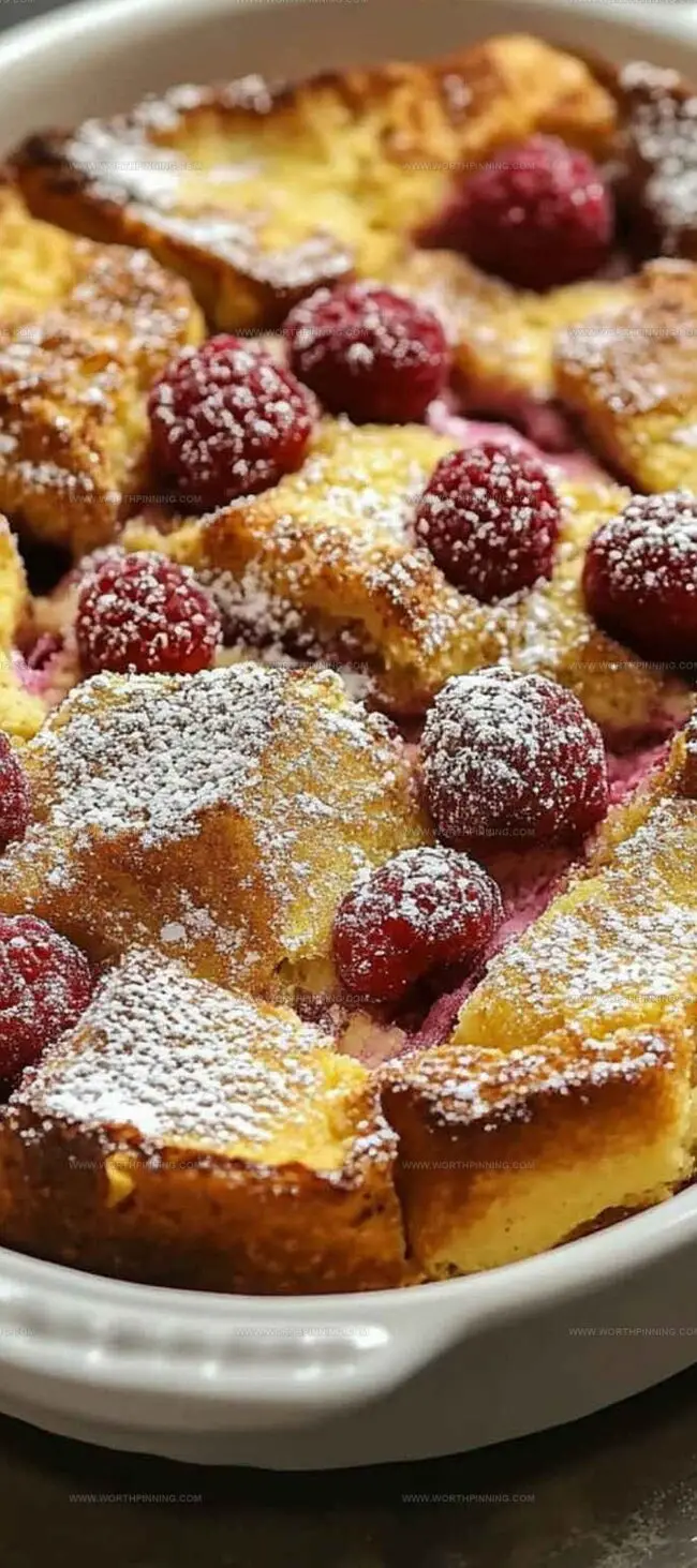 Arrange bread slices in a buttered baking dish, generously scatter fresh raspberries, then cover with another layer of bread. Gently pour the custard over the layers, ensuring each bread piece soaks up the delicious mixture.