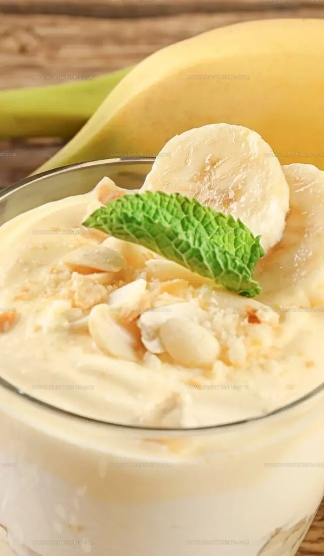 - Delicately spoon the prepared pudding mixture over the banana layer, spreading evenly to create a smooth surface.