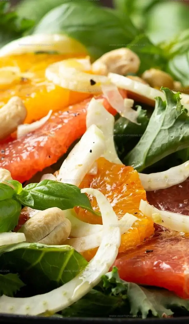 - Transfer sliced fennel, orange segments, and peppery arugula into a spacious serving bowl. Gently cascade the prepared vinaigrette over the ingredients, using light folding motions to ensure even distribution without bruising delicate leaves.