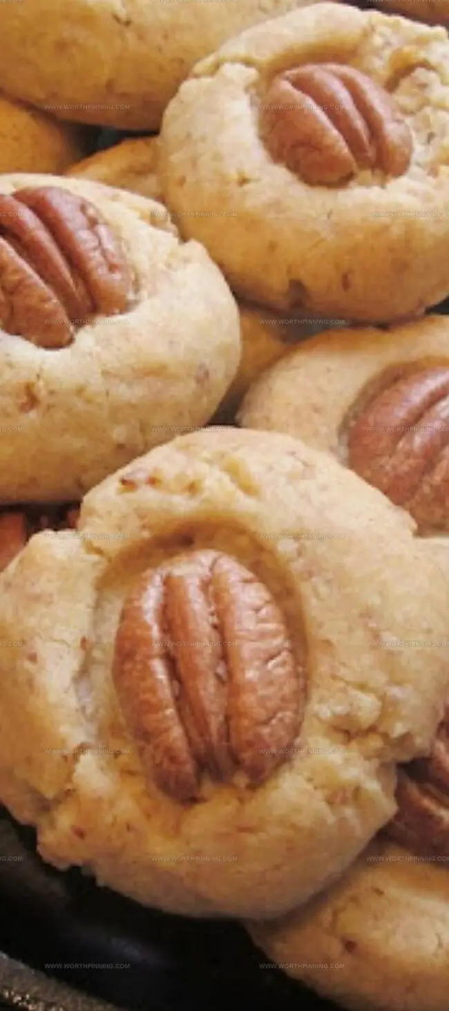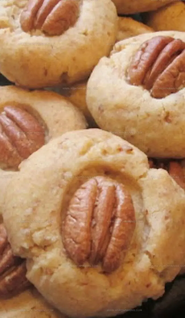 Roll dough into 1-inch balls and place on a parchment-lined baking sheet. Gently press a whole pecan half into the center of each cookie. Bake for 20-25 minutes until edges turn golden brown.