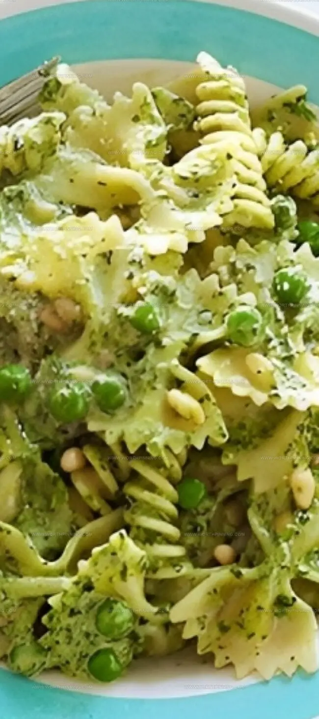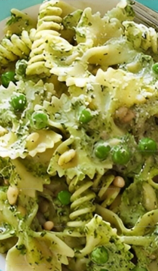 - Cascade the creamy pesto mixture over cooled pasta. Introduce grated Parmesan (1/2 cup or 50 grams), thawed green peas, toasted pine nuts, kosher salt, and freshly ground black pepper to the mixing bowl.