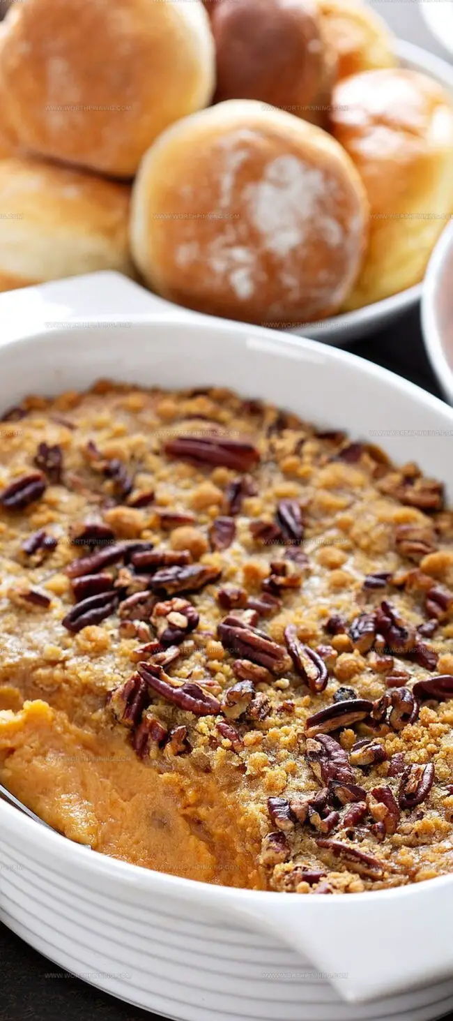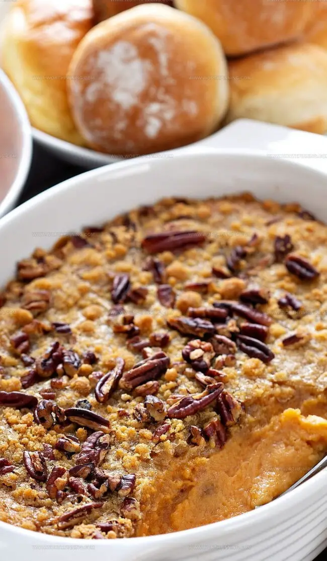 - Dish Assembly: Grease a casserole dish and evenly spread the sweet potato mixture across the surface. Create the crumble topping by mixing all-purpose flour, brown sugar, and chopped nuts, then incorporate softened butter until it forms coarse crumbs.