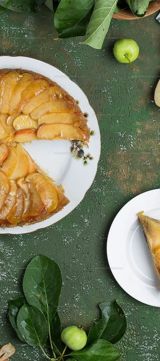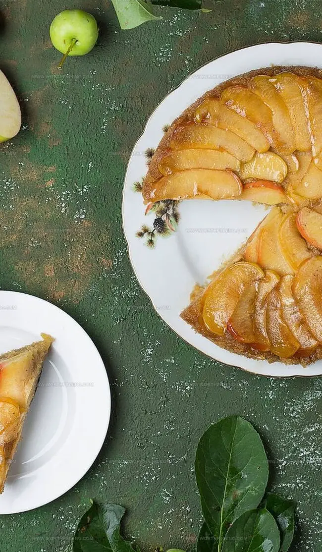 - Position the serving plate over the pan and swiftly but carefully flip the entire dish in one smooth motion. Allow the tart to rest for a few minutes, enabling the caramel to cool slightly. Slice and serve with a scoop of vanilla ice cream or a dollop of crème fraiche.