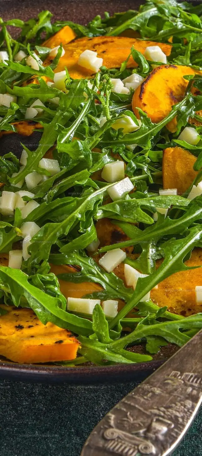 - Gently add crisp, peppery arugula leaves to the dressing, carefully folding and coating each leaf to ensure an even distribution of the tangy marinade.