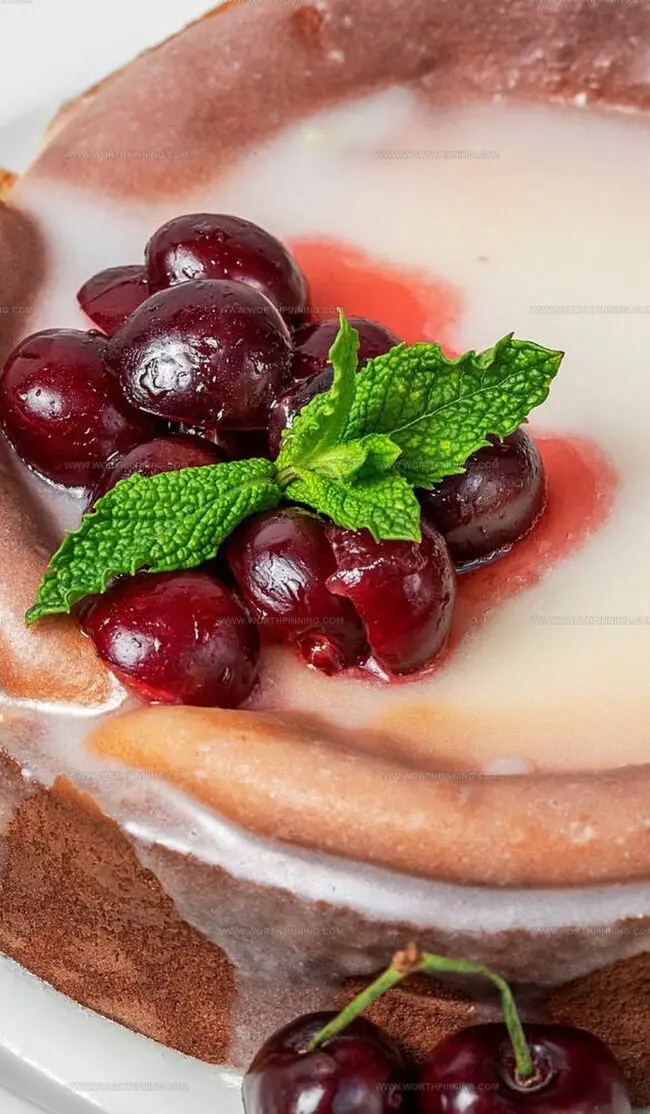 Cherries poached in subtle sweetness provide perfect accompaniment, elevating this classic dessert.