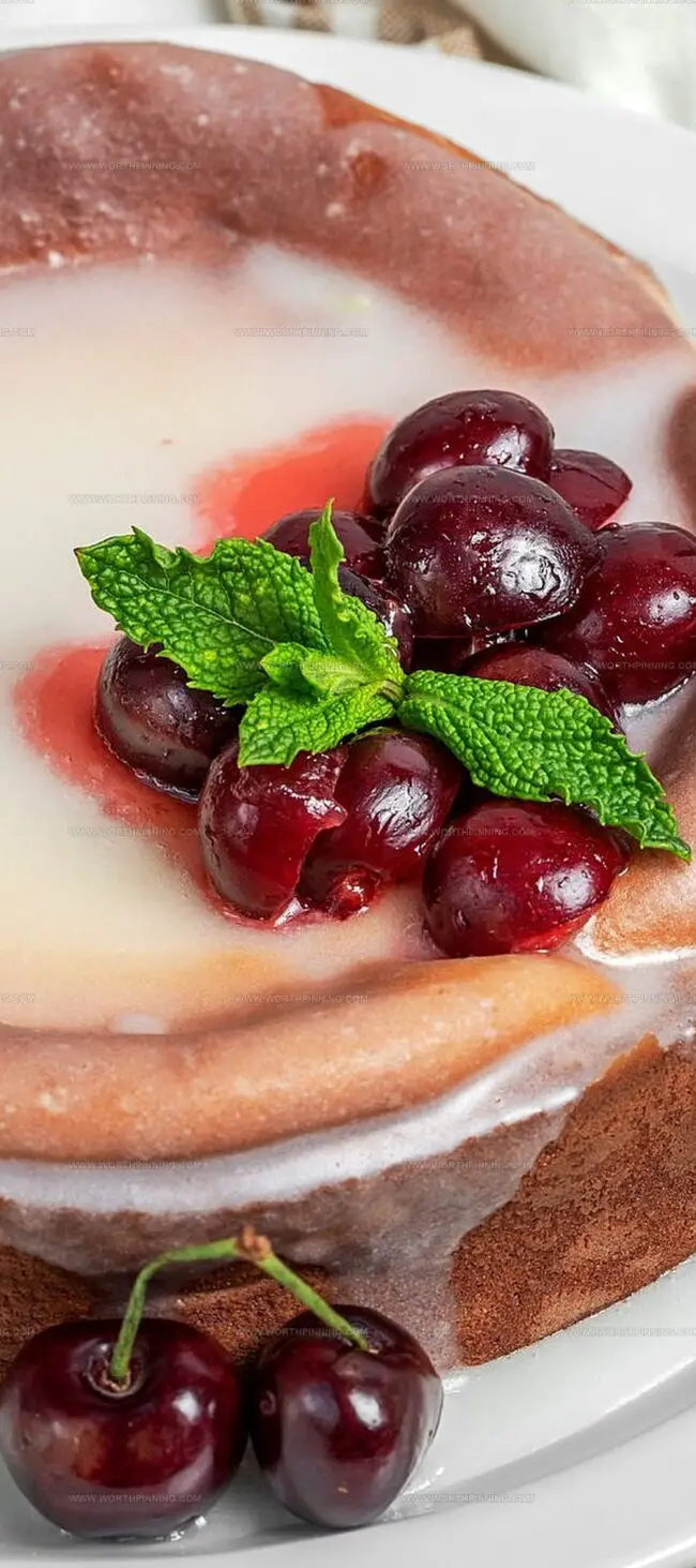 - Once cooled, spoon the cherry compote over the chilled cheesecake and dust lightly with powdered sugar before serving.