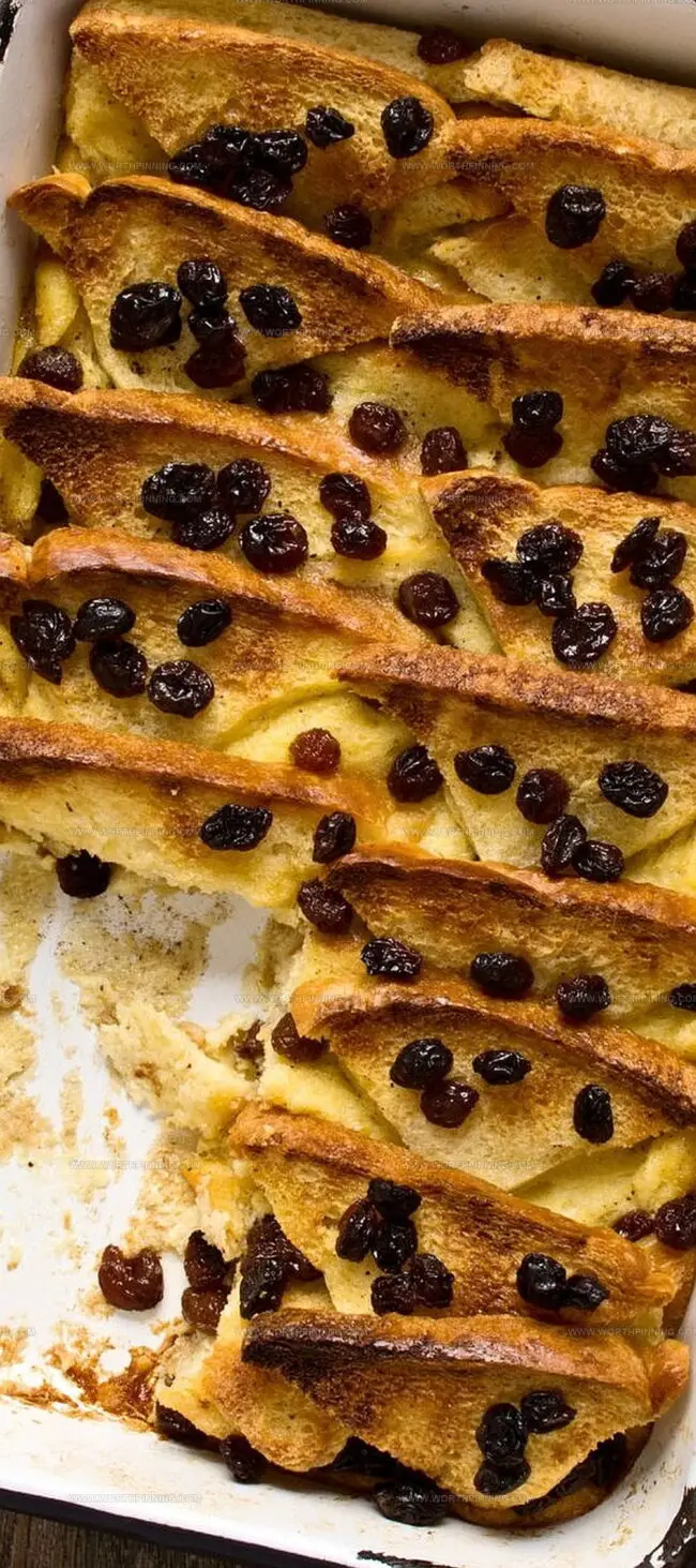 Rich layers of buttered bread and golden raisins create sweet harmony beneath silky custard.