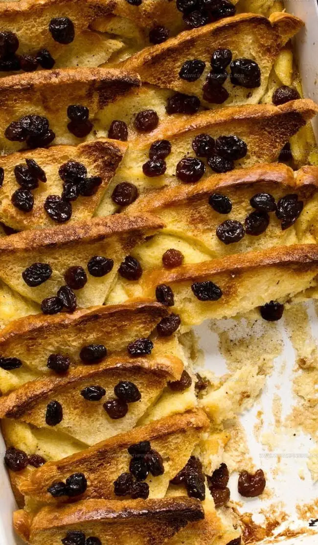 - Repeat the layering process with remaining bread, raisins, nutmeg, and cinnamon until the dish is filled to the brim.