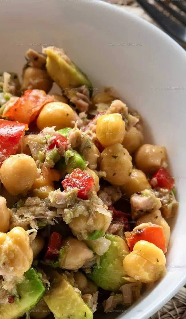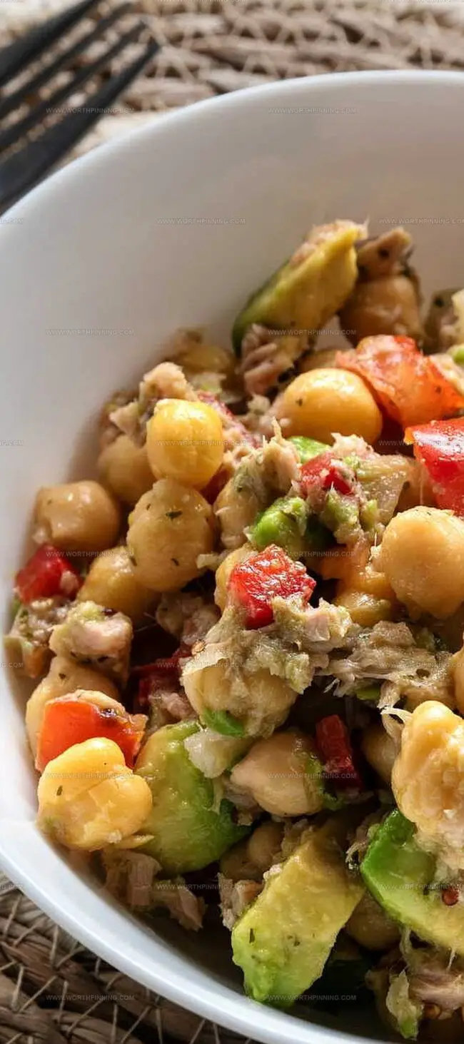 Heat chickpeas in a pan. Transfer 90% of the warm chickpeas into the bowl. Mash the remaining 10% of chickpeas into a creamy paste. Stir the paste into the salad to create a rich, smooth texture.