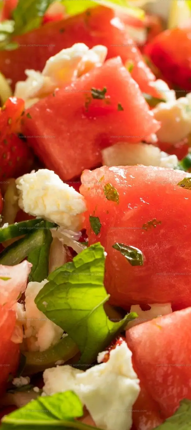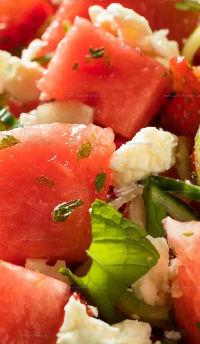 Crisp cucumber slices intermingle with sweet, juicy watermelon chunks, creating a symphony of textures.