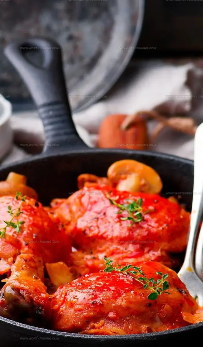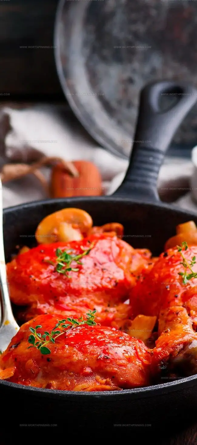 French soldiers’ favorite battlefield dish comes alive with tender chicken, rich tomato sauce, and classic Mediterranean ingredients. Napoleonic history meets culinary elegance in this hearty skillet meal you’ll savor with rustic charm.