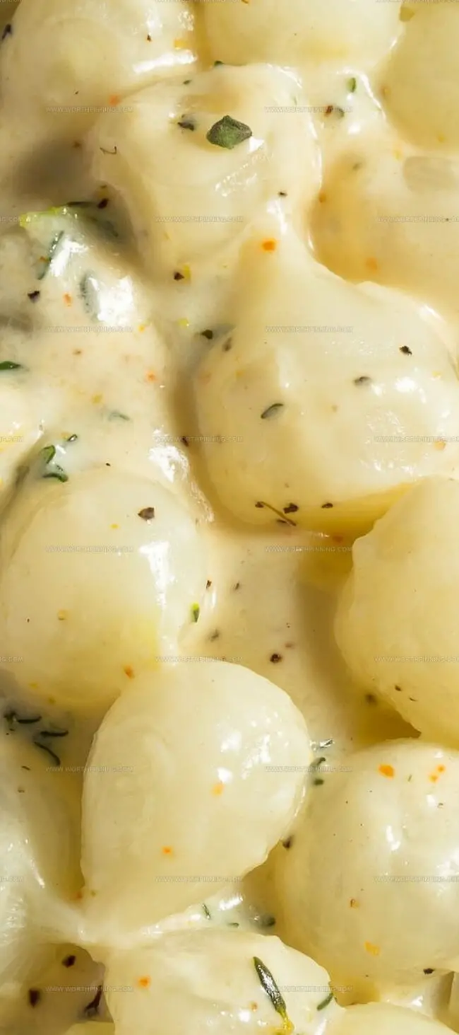 Soft, tender onions absorb the creamy sauce, creating a harmonious blend of subtle flavors and textures.