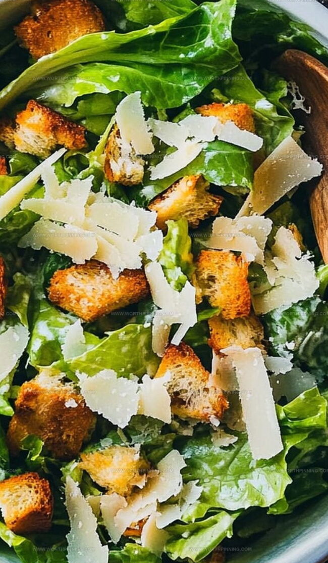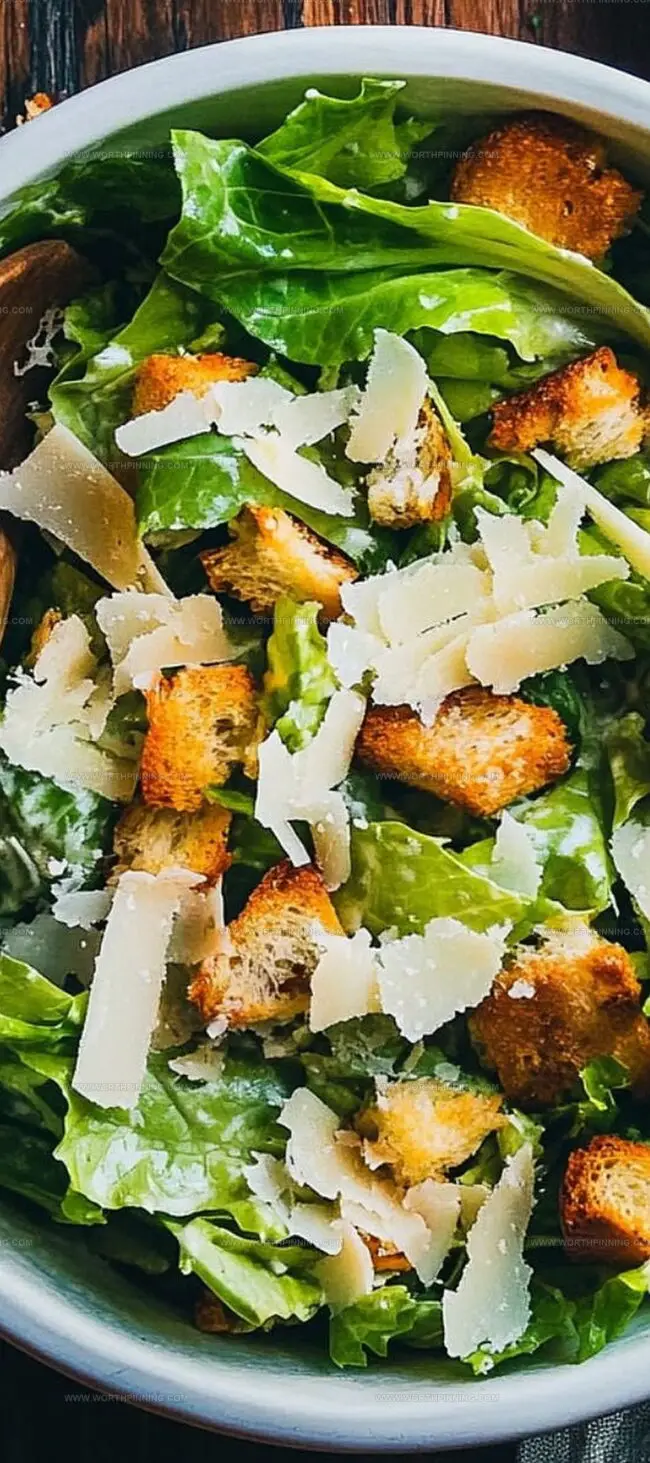 Select crisp romaine lettuce and tear into bite-sized pieces. Place lettuce in a large serving bowl. Pour prepared dressing over lettuce and toss gently to coat evenly. Sprinkle cooled croutons throughout the salad. Top with additional shaved or shredded parmesan cheese. Serve immediately for maximum flavor and crunch.