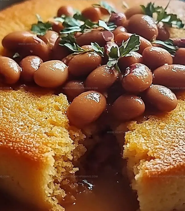 Smooth pinto beans nestled alongside golden cornbread create a perfect harmony of textures and flavors.