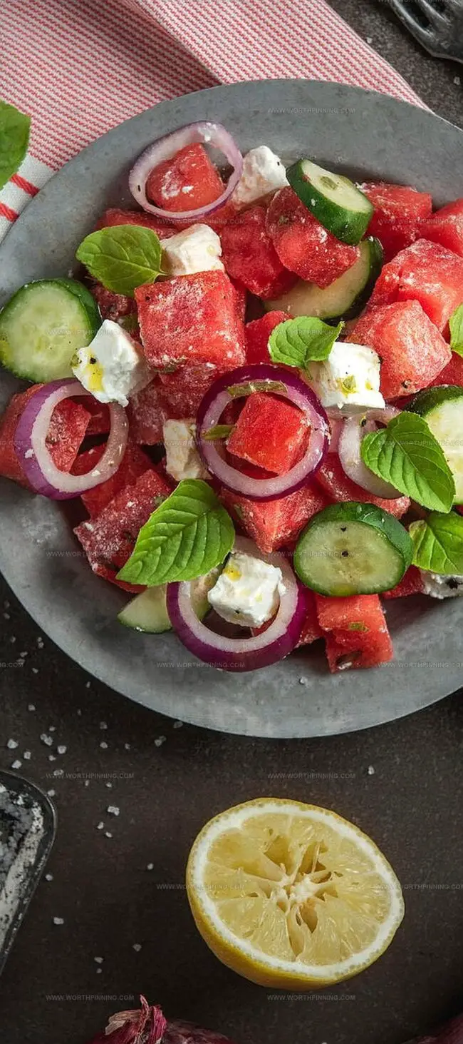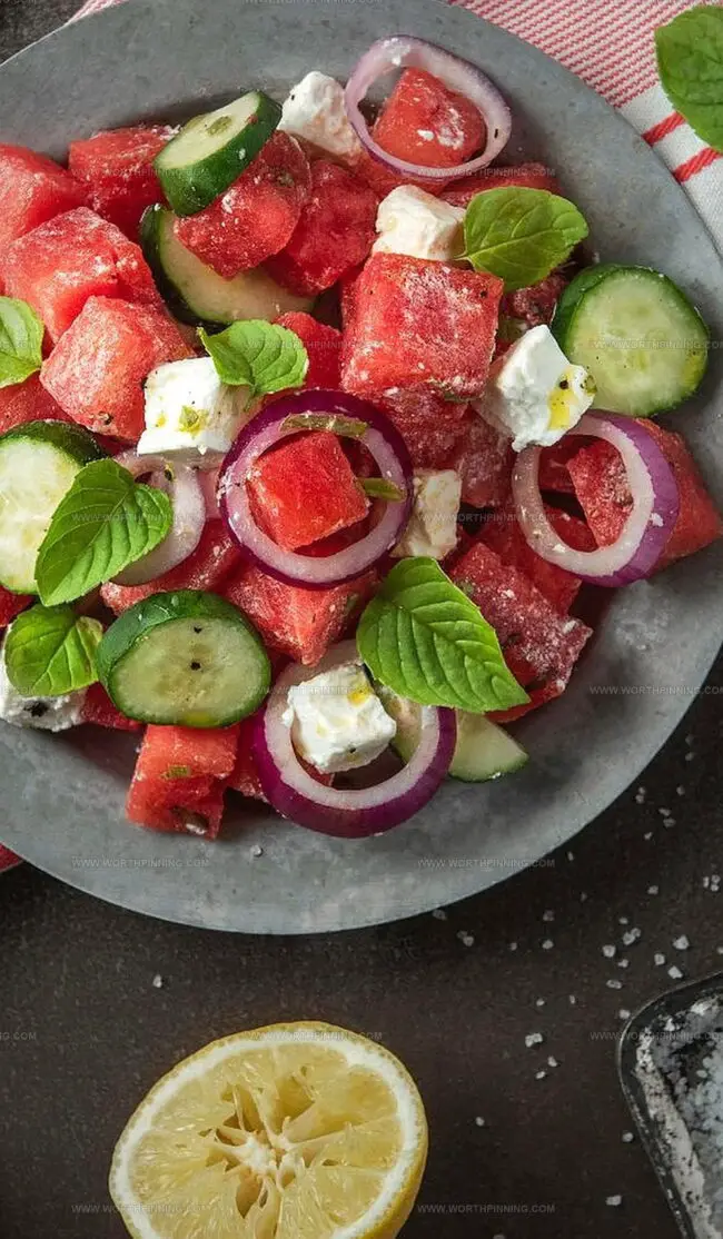- Pour the prepared dressing over the salad and delicately toss the ingredients to ensure even coating without crushing the delicate watermelon pieces.