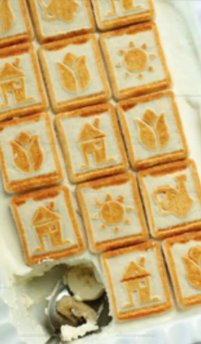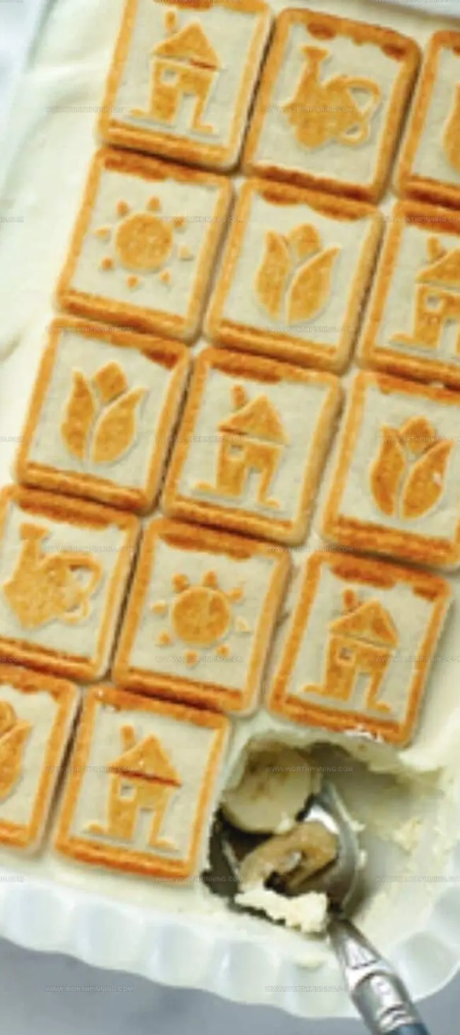 Rich cream cheese whispers creamy secrets through layers of delicate cookies and ripe bananas.