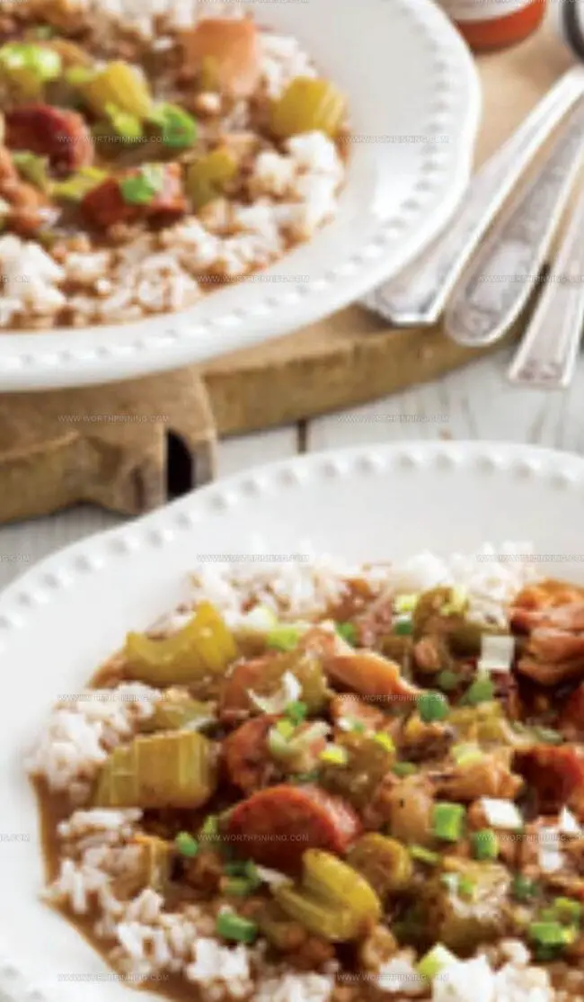 Complex layers of flavor dance between spicy sausage, tender chicken, and deep chocolate-hued roux.