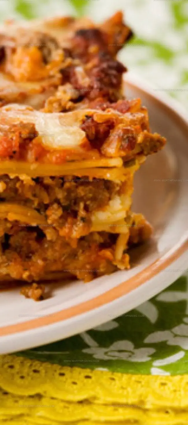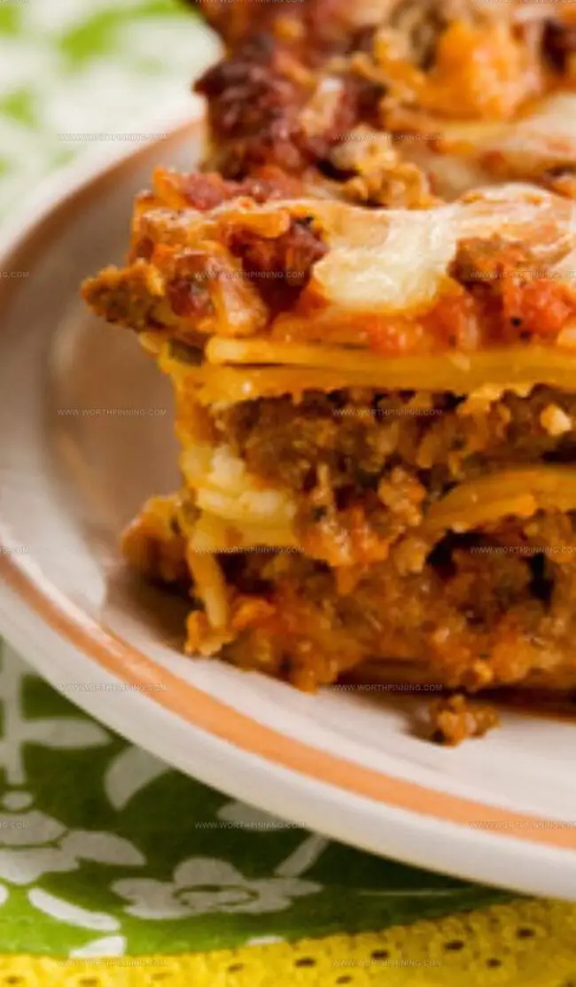 Robust meat sauce mingles with soft pasta layers, creating a harmonious blend of textures and flavors.