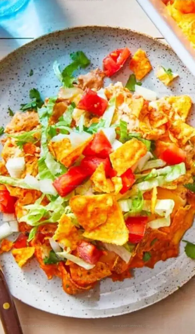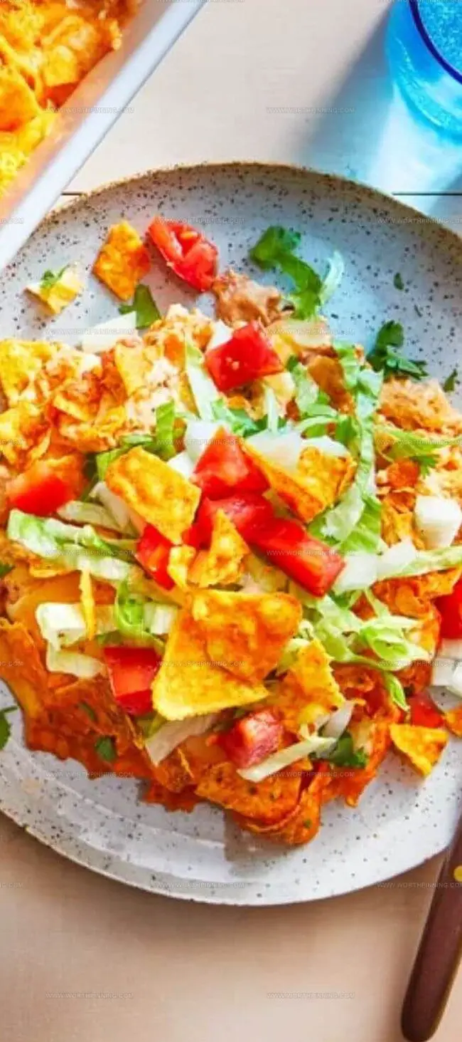 Layers of crispy chips, tender chicken, and melted cheese create a mouthwatering masterpiece perfect for family gatherings or weeknight dinners.
