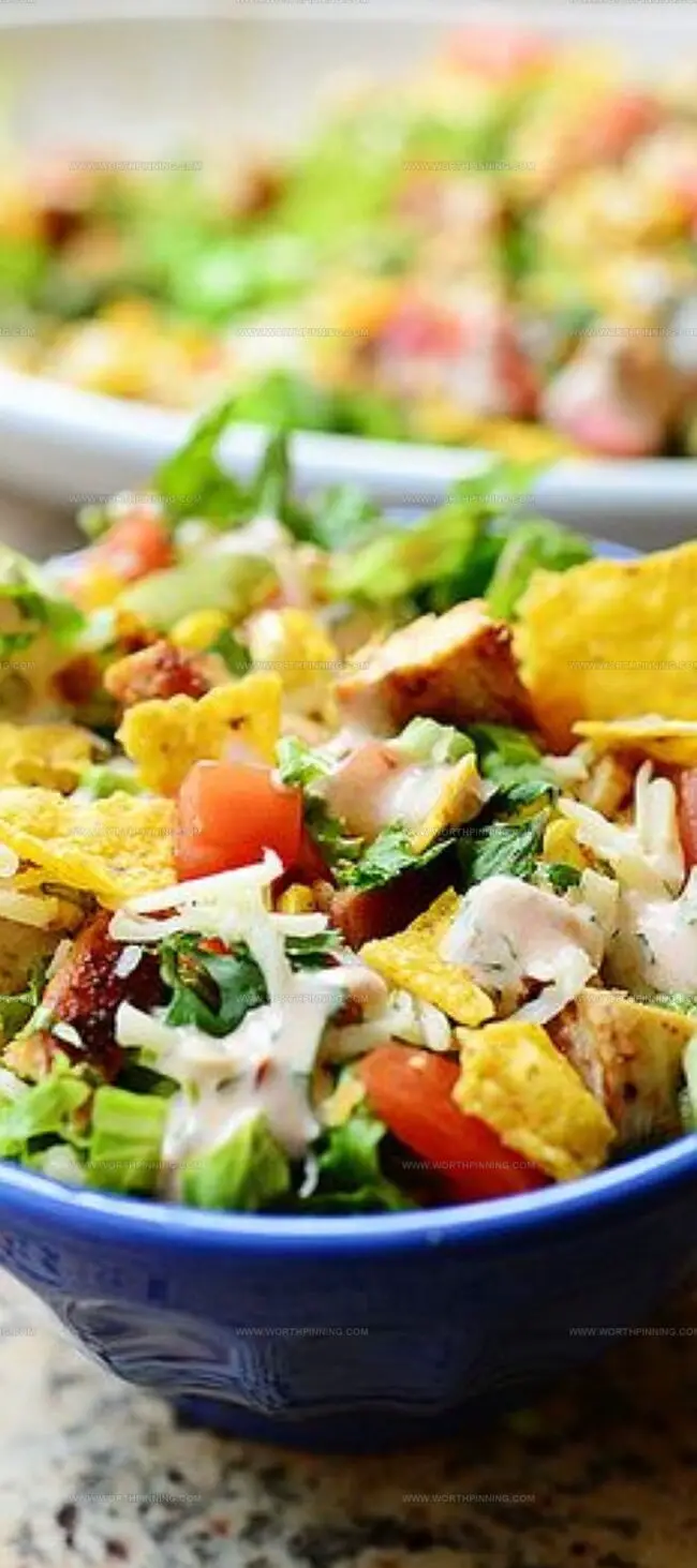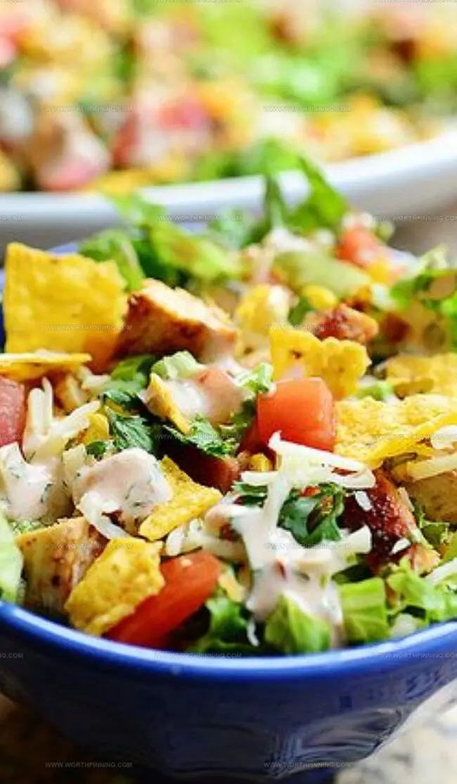- Construct a visually appealing salad foundation by arranging crisp, shredded lettuce as the base. Layer cubed seasoned chicken, juicy diced tomatoes, melty shredded cheese, roasted corn kernels, creamy avocado cubes, delicate green onion slices, and fresh cilantro leaves. Introduce textural contrast by sprinkling crushed tortilla chips across the top.