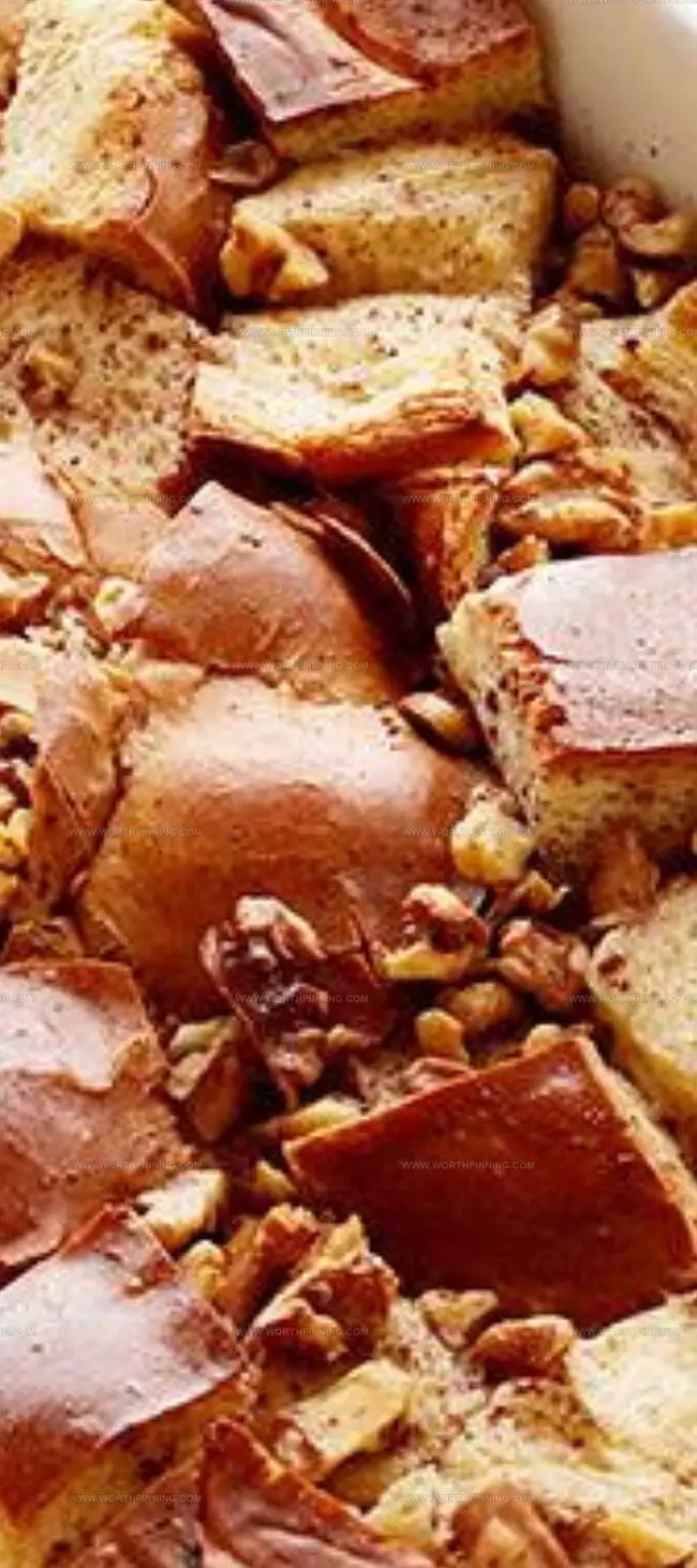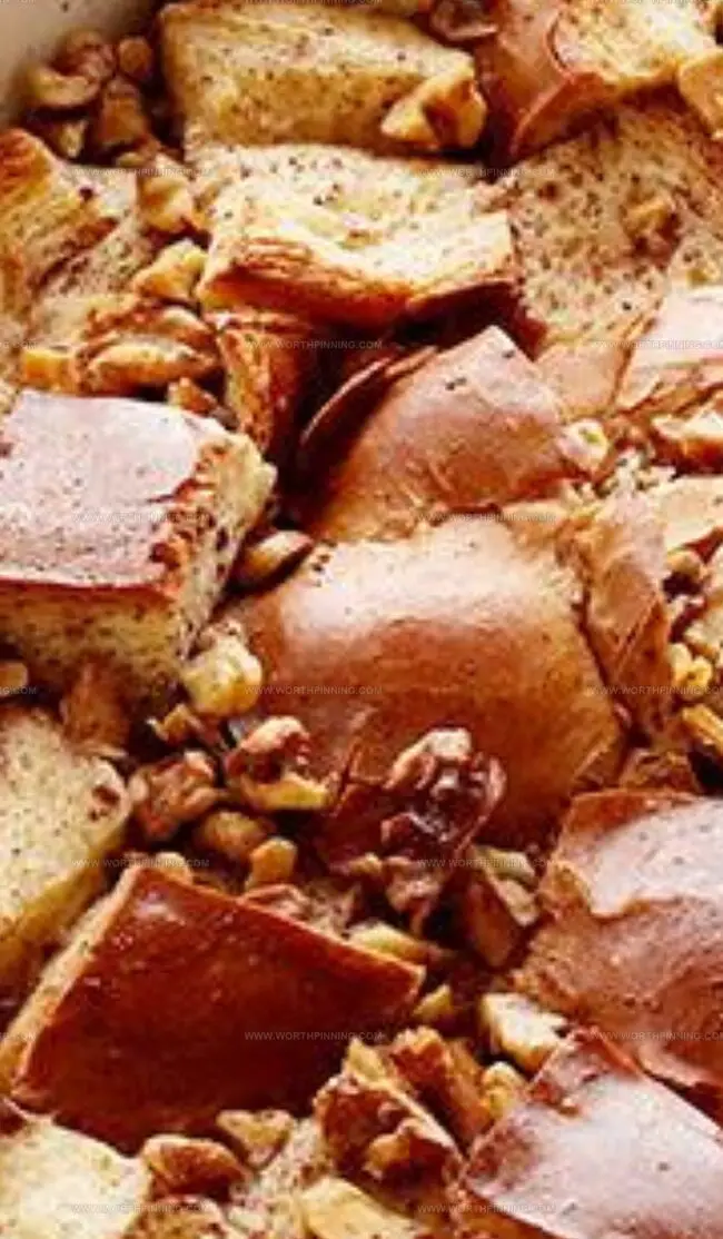 Grab day-old bread and dice it into 1-inch cubes. Chop some walnuts for extra crunch. Spread the bread and nuts evenly in your baking dish. Pour the custard over the bread, making sure every piece gets soaked. Let it rest for 15 minutes to absorb all those delicious flavors.