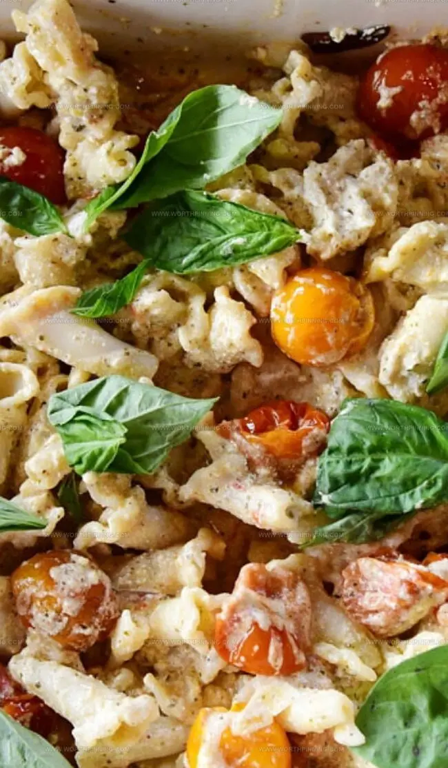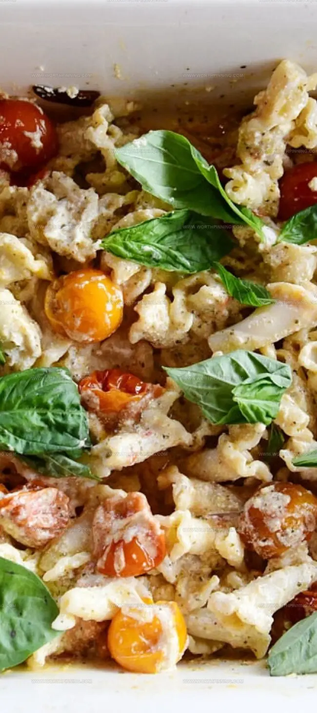 - Extract the roasted dish, introducing pesto to the molten tomato and cheese landscape. Gently fold ingredients, delicately breaking goat cheese to create a silky sauce. Incrementally incorporate reserved pasta water to achieve desired creamy texture. Fold cooked pasta thoroughly, ensuring complete sauce coverage. Finish by scattering torn fresh basil leaves as a vibrant garnish.