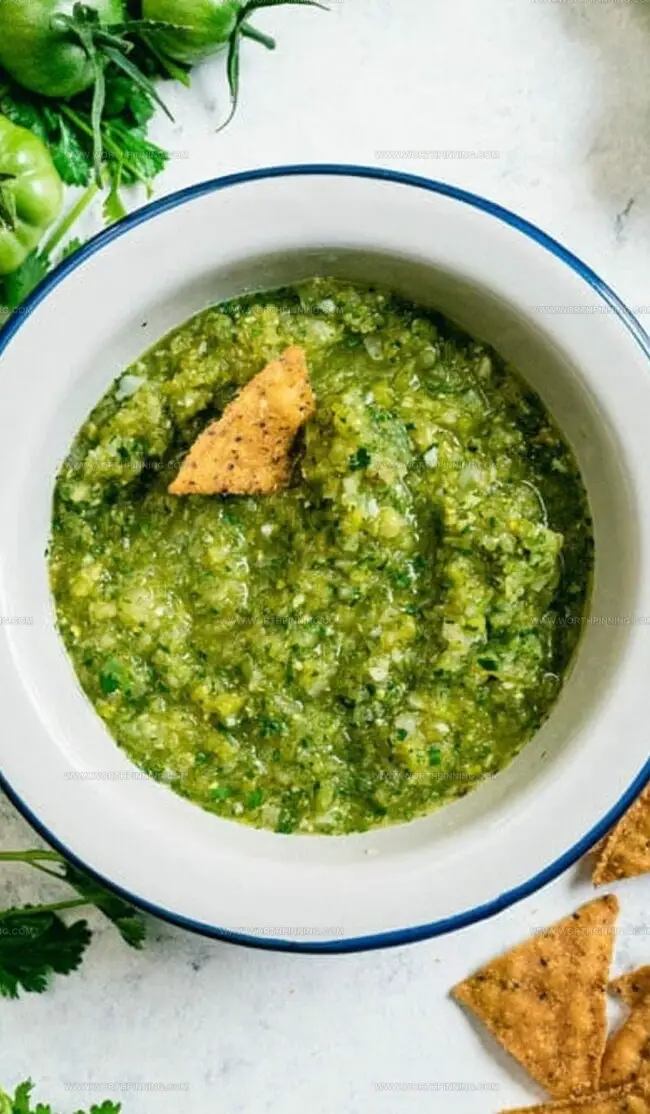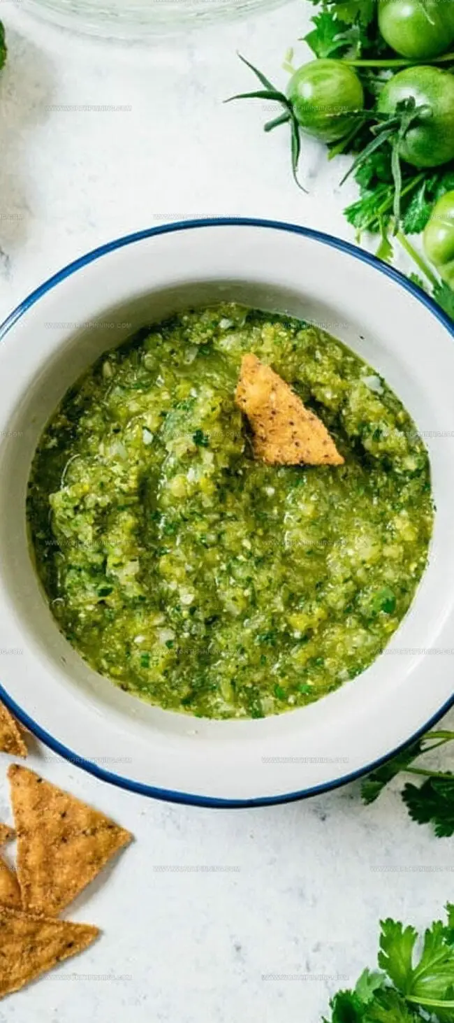 Bold green tomato salsa brings Mexican garden flavors to life with zesty jalapeños and fresh cilantro. Rustic ingredients blend seamlessly, delivering a tangy kick that will make you crave more with each spoonful.