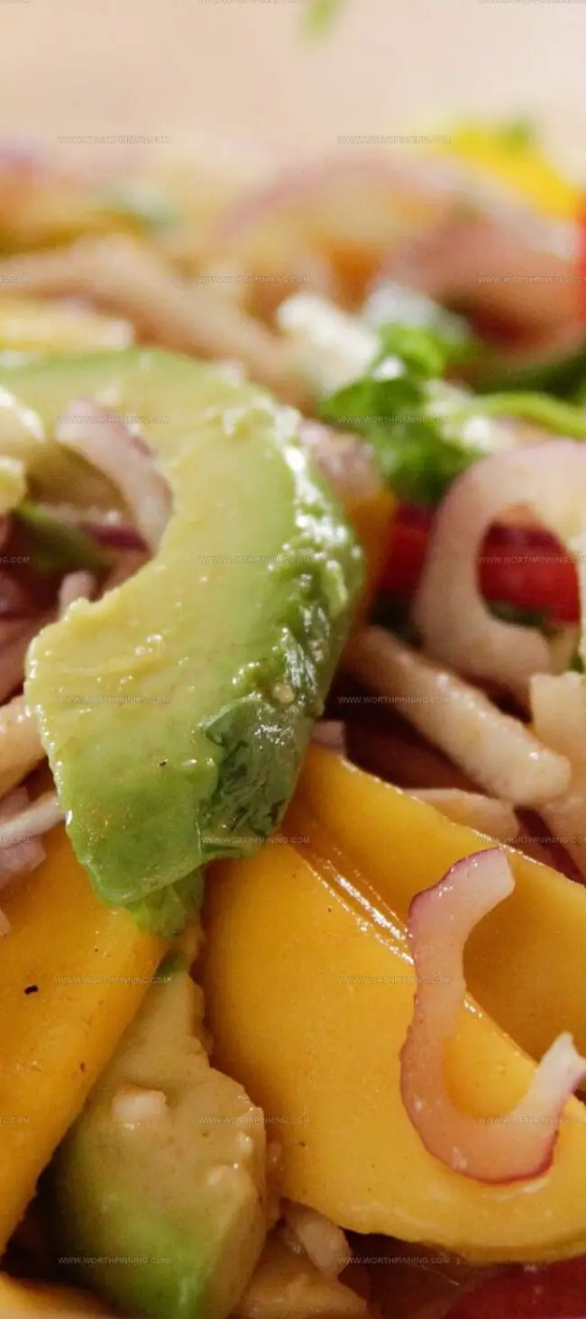 Lime-infused dressing weaves magic through crisp vegetables and ripe fruit elements.