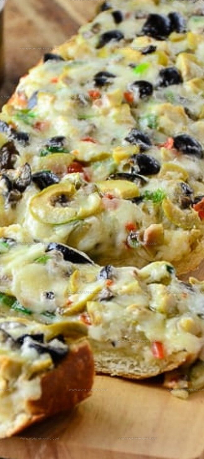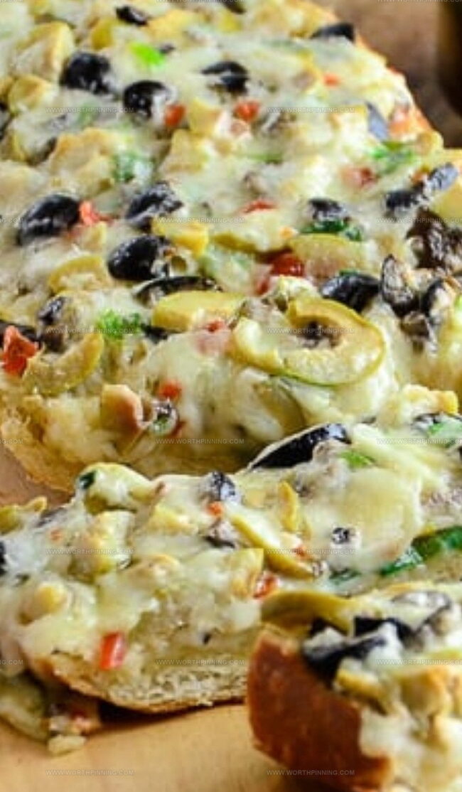 Salty, cheesy goodness awaits passionate appetizer enthusiasts with Pioneer Woman’s olive cheese bread.