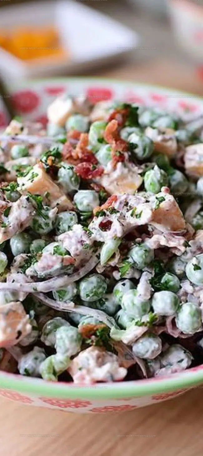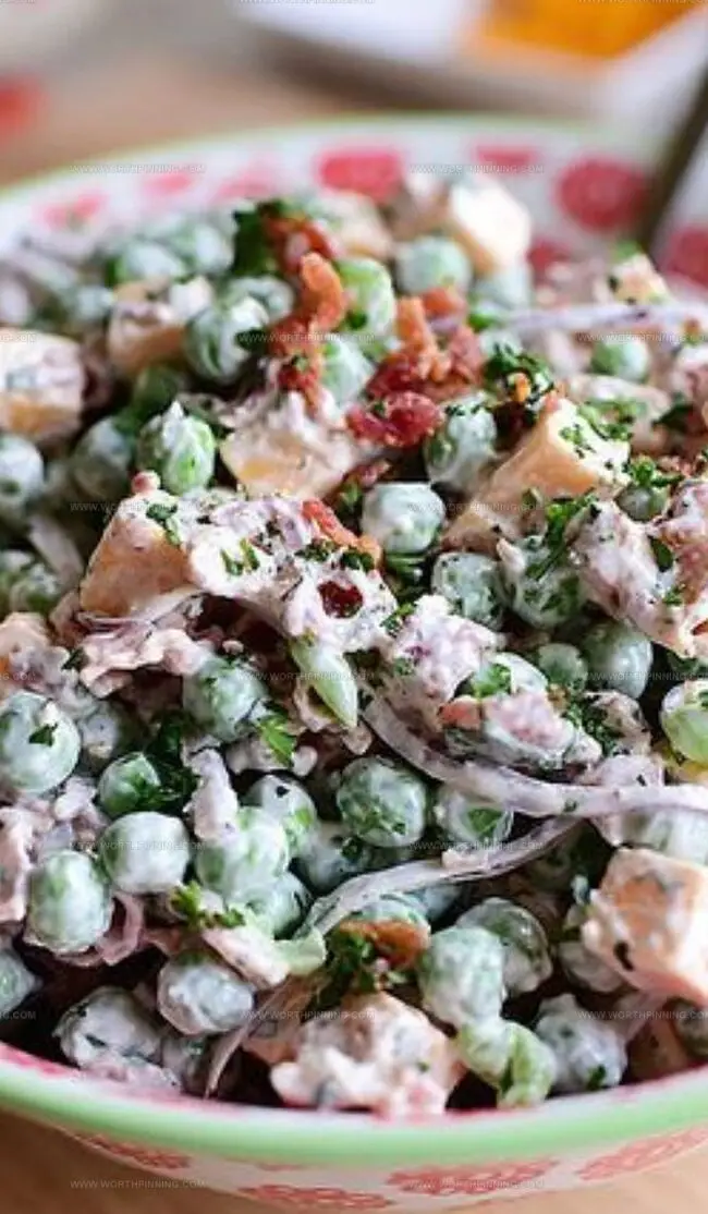 - Elevate the salad’s texture by ensuring bacon remains crispy and peas are tender but not mushy.