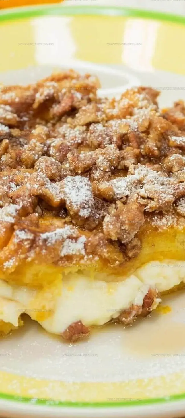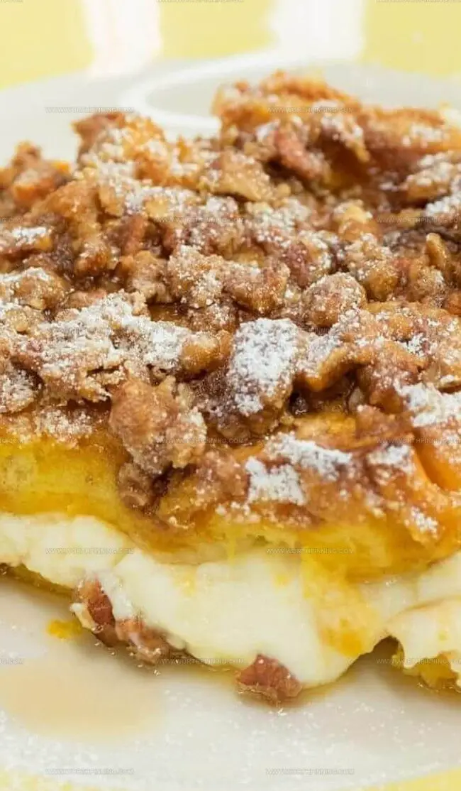 - Layer the remaining bread slices with the reserved custard, positioning them carefully atop the cream cheese layer. In a separate small bowl, combine chopped pecans, dark brown sugar, kosher salt, and 4 tablespoons of melted butter, mixing until the ingredients form a crumbly topping.
