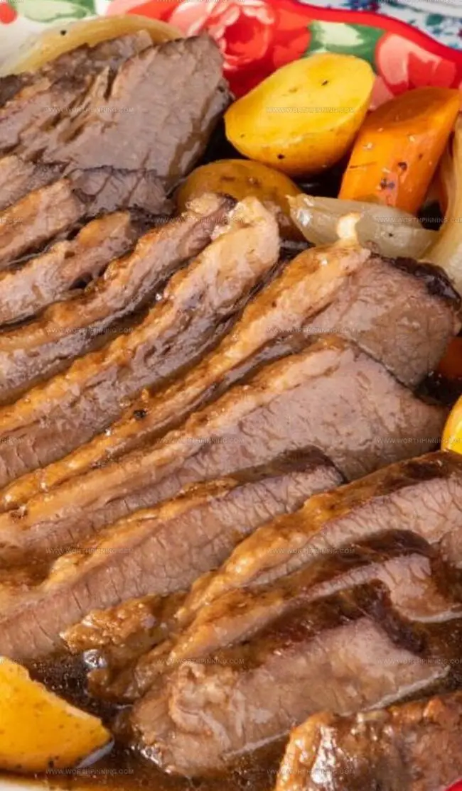 - Carefully transfer the cooked brisket to a cutting board using sturdy tongs. Remove and discard the exterior fat cap. Slice the meat perpendicular to the grain into uniform, approximately 1/4-inch (0.6-centimeter) thick portions. Present the sliced brisket hot, accompanied by the tender vegetables and enriched with the deeply flavored cooking liquid gravy.