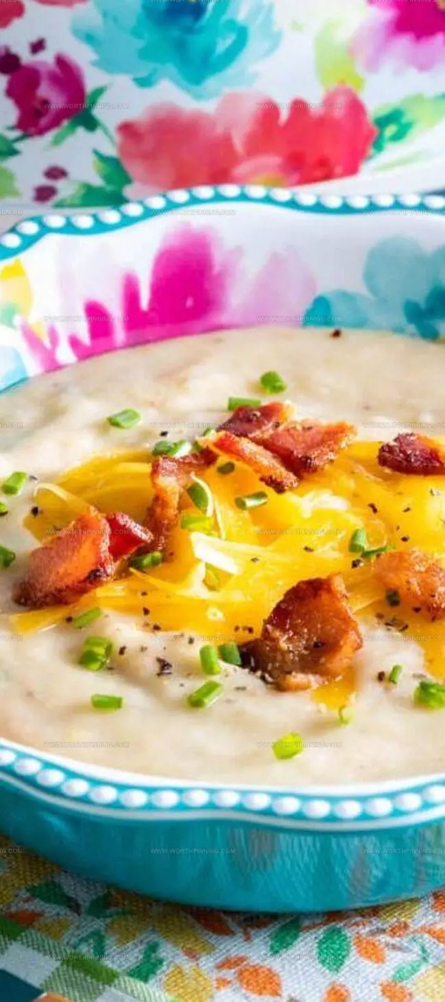 - Elegantly portion soup into serving vessels. Embellish each portion with sharp cheddar cheese shreds, delicate chive segments, additional sour cream dollop, and reserved bacon crumbles for sophisticated presentation.